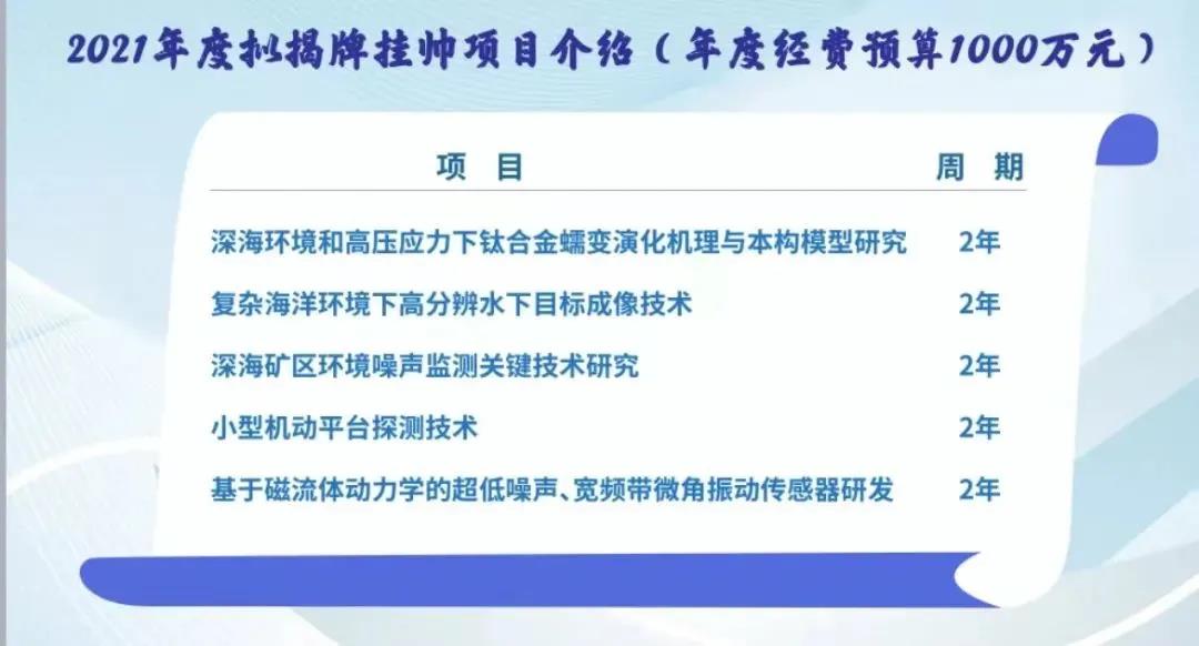 本次5個揭榜掛帥項目分別為:深海環(huán)境和高壓應(yīng)力下鈦合金蠕變演化機理與本構(gòu)模型研究、復(fù)雜海洋環(huán)境下高分辨水下目標(biāo)成像技術(shù)、深海礦區(qū)環(huán)境噪聲監(jiān)測關(guān)鍵技術(shù)研究、小型機動平臺探測技術(shù)、基于磁流體動力學(xué)的超低噪聲、寬頻帶微角振動傳感器研發(fā)。