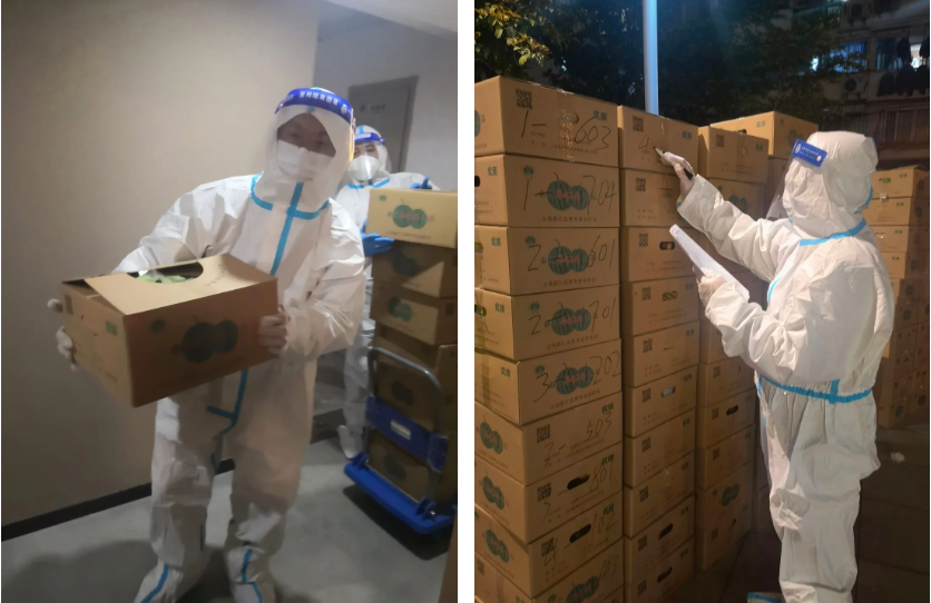 由于防護服有限,居住在黃浦區(qū)某社區(qū)的集團職工中只有鄭珂成了志愿者,只見他時而忙著卸貨分裝,時而忙著打包標(biāo)記,7棟樓近400戶居民共計幾百公斤的物資,都由他一人完成了分裝和標(biāo)記工作。在他服務(wù)的對象中,既有身在涉疫樓棟無法出戶的同事,也有素未謀面的鄰居。