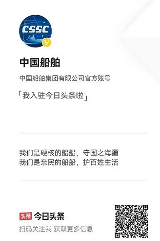 繼中國(guó)船舶官方抖音號(hào)之后,中國(guó)船舶官方頭條號(hào)今天也正式開通!