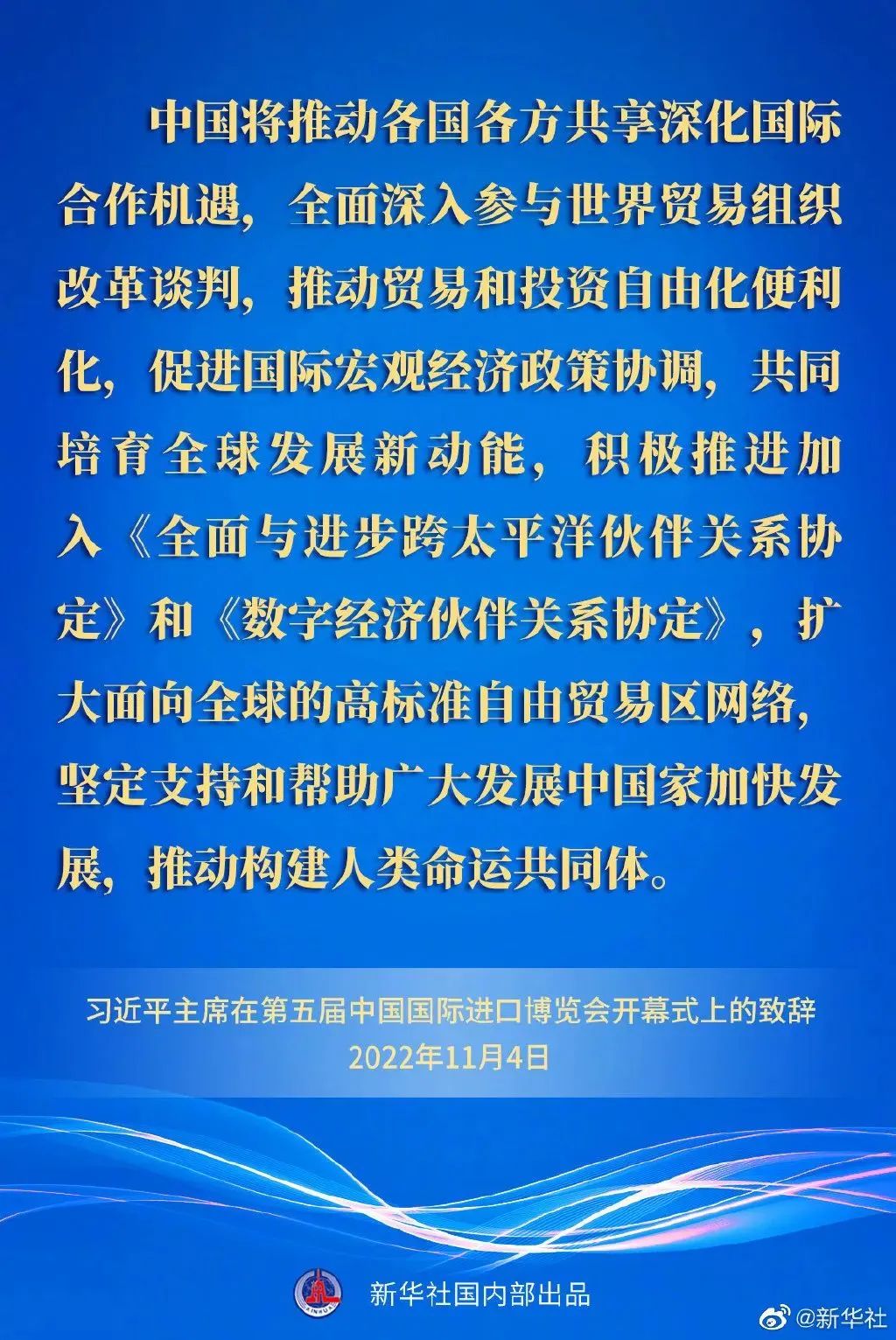 ——中國(guó)將推動(dòng)各國(guó)各方共享深化國(guó)際合作機(jī)遇,全面深入?yún)⑴c世界貿(mào)易組織改革談判,推動(dòng)貿(mào)易和投資自由化便利化,促進(jìn)國(guó)際宏觀經(jīng)濟(jì)政策協(xié)調(diào),共同培育全球發(fā)展新動(dòng)能,積極推進(jìn)加入《全面與進(jìn)步跨太平洋伙伴關(guān)系協(xié)定》和《數(shù)字經(jīng)濟(jì)伙伴關(guān)系協(xié)定》,擴(kuò)大面向全球的高標(biāo)準(zhǔn)自由貿(mào)易區(qū)網(wǎng)絡(luò),堅(jiān)定支持和幫助廣大發(fā)展中國(guó)家加快發(fā)展,推動(dòng)構(gòu)建人類命運(yùn)共同體。