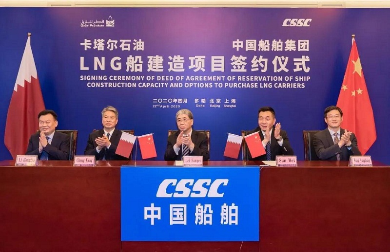 ????4月22日,中國(guó)船舶集團(tuán)與卡塔爾石油公司在中國(guó)北京、上海及卡塔爾多哈三地以“云簽約”方式聯(lián)合簽署“中國(guó)船舶—卡塔爾石油液化天然氣(LNG)船建造項(xiàng)目”協(xié)議,所涉訂單總金額超過200億元人民幣。這是卡塔爾天然氣項(xiàng)目首批訂單,也是中國(guó)船企迄今承接的金額最大的造船出口訂單。中國(guó)船舶集團(tuán)和卡塔爾石油將強(qiáng)強(qiáng)聯(lián)手,依托各自優(yōu)勢(shì)在能源運(yùn)輸、裝備制造及全球化服務(wù)等領(lǐng)域開展廣泛合作。