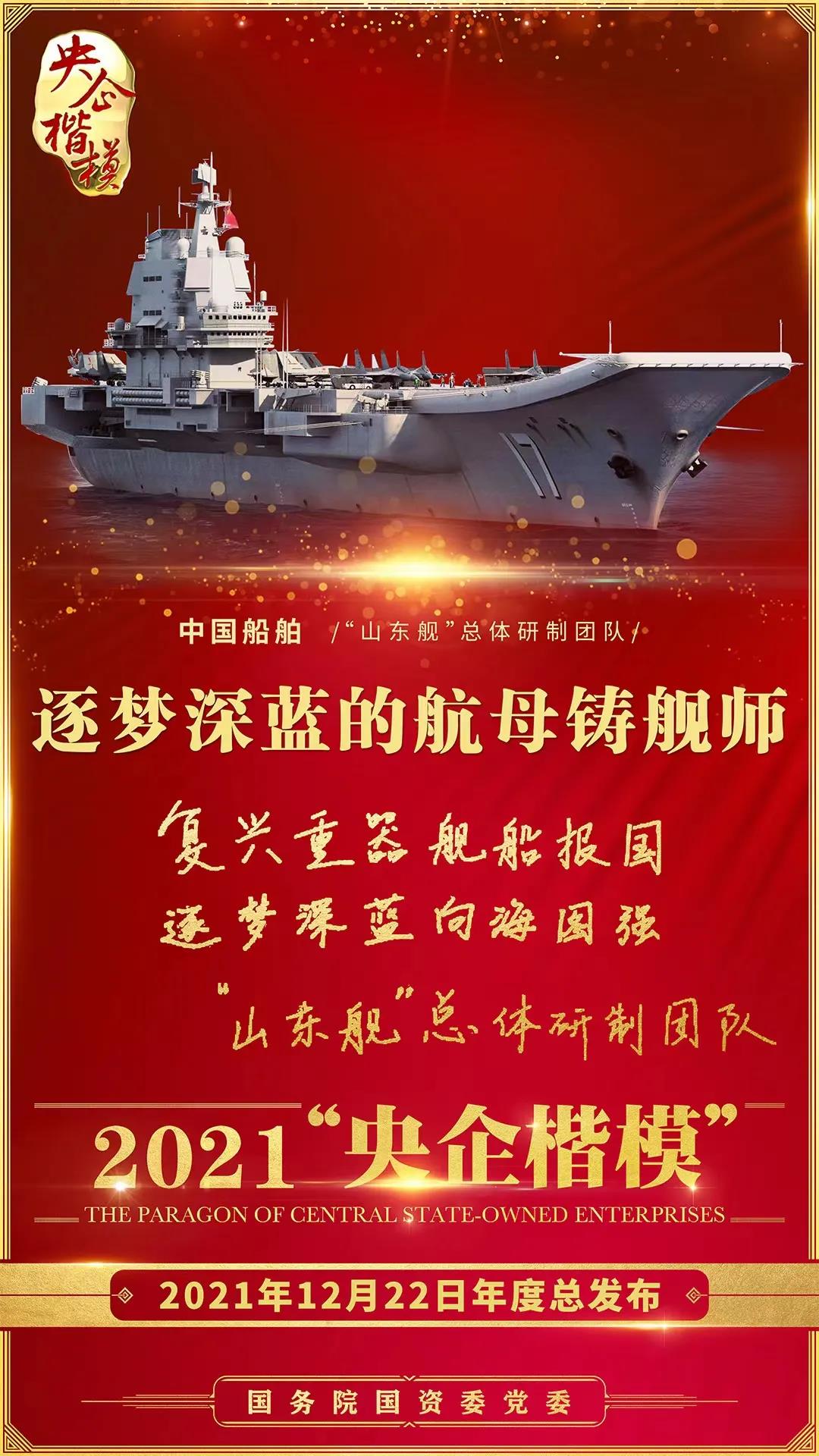 12月22日,國務(wù)院國資委黨委舉行2021年第二批“央企楷?!卑l(fā)布暨年度總發(fā)布儀式,中國船舶“山東艦”總體研制團隊榮獲2021年“央企楷?!睒s譽稱號。繼“奮斗者”號萬米載人潛水器研發(fā)團隊獲評2020年“央企楷?!睒s譽稱號后,中國船舶集團再獲此殊榮。
