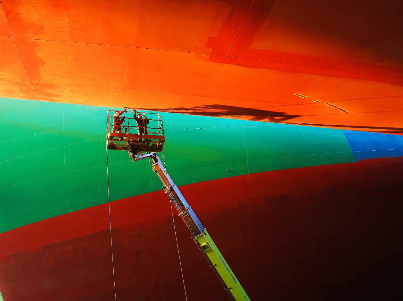 兩位打磨工人駕駛高空車對外板進行清潔施工,這個瞬間,他們?nèi)缤蒙碛谕挳?dāng)于一般。