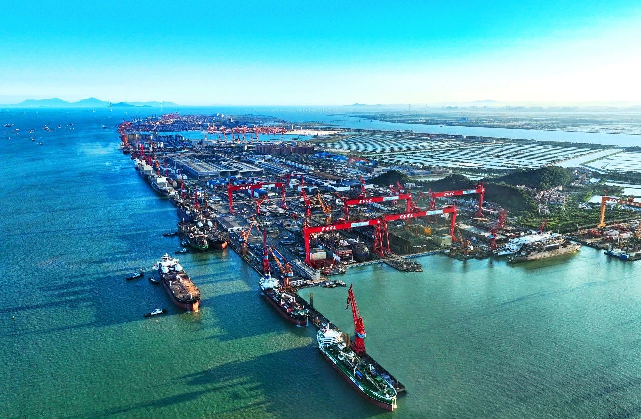 落日余暉下,造船現(xiàn)場燈火通明,展現(xiàn)出一派繁忙景象。在五彩斑斕的晚霞襯托下,整個造船基地猶如寶石般熠熠生輝。