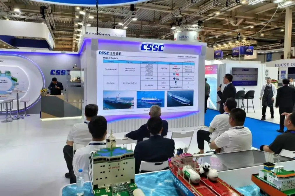 此次展會,中國船舶集團(tuán)攜旗下19家成員單位參展,有關(guān)成員單位負(fù)責(zé)人率隊赴展會開展重點船海項目經(jīng)營洽談并拜訪當(dāng)?shù)睾椭苓厙铱蛻?。集團(tuán)公司以“共贏未來”為參展主題,設(shè)置集團(tuán)總體區(qū)、綠色航運(yùn)解決方案區(qū)、低碳環(huán)保配套設(shè)備區(qū)共3個展示區(qū)域,重點展示了135500總噸大型郵輪、175000方LNG運(yùn)輸船、24000箱超大型集裝箱船、210000噸氨燃料散貨船、LNG雙燃料VLCC等一系列高技術(shù)、高附加值明星產(chǎn)品,以及CPGC-WinGD 10X92DF-M甲醇雙燃料發(fā)動機(jī)、船用碳捕捉系統(tǒng)等全球船東高度關(guān)注的綠色低碳配套設(shè)備。同時,通過展臺上醒目的品牌標(biāo)識、層級化的品牌體系圖、富有感染力的品牌推介視頻,首次面向全球客戶,立體化展示“中國船舶”品牌及下屬企業(yè)品牌和產(chǎn)品品牌體系,進(jìn)一步強(qiáng)化了集團(tuán)公司品牌形象。