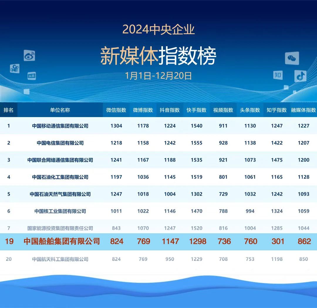 2024年——中船集團(tuán)新媒體平臺綜合指數(shù)進(jìn)入2024年度中央企業(yè)新媒體指數(shù)榜前20!
