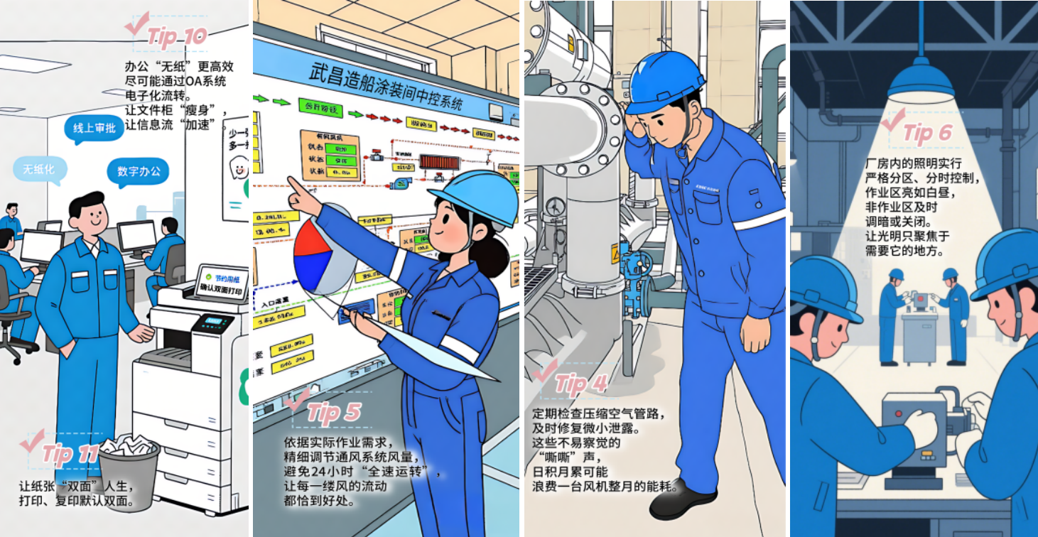 武昌造船在節(jié)能宣傳周期間組織開展了“船廠節(jié)能秘籍”征集活動(dòng),以船廠員工的一天為軸線,收集到各類節(jié)能基本操作,形成了《這些基本操作,我知道你一定能做到》宣傳材料,并通過公司公眾號(hào)發(fā)布,向員工普及節(jié)能知識(shí)與技巧,擴(kuò)大節(jié)能宣傳覆蓋面。同時(shí)開展 “停用空調(diào)”能源緊缺體驗(yàn)行動(dòng),倡議全體員工在全國(guó)低碳日,關(guān)閉辦公室、會(huì)議室及非必要區(qū)域空調(diào)設(shè)備,通過實(shí)際行動(dòng)感受能源緊缺,踐行節(jié)能理念,進(jìn)一步增強(qiáng)員工資源憂患意識(shí)。