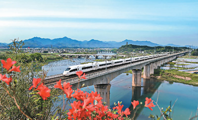 4月14日,一列動(dòng)車穿行“中國(guó)最美高鐵”合福線新安江休寧古城巖大橋。徐 明攝(人民視覺)