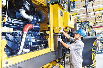 圖為山東臨工工程機械有限公司的工人在裝載機生產(chǎn)線上作業(yè)。