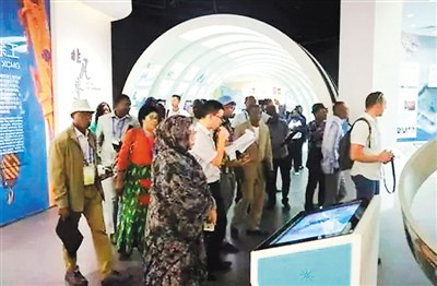 來自非洲12個發(fā)展中國家基礎(chǔ)設(shè)施建設(shè)及規(guī)劃相關(guān)部門的高級官員在徐工集團展廳內(nèi)參觀。