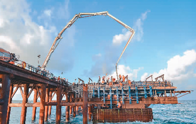 7月6日,隨著主橋23號墩承臺最后一車混凝土的澆筑,中國援馬爾代夫中馬友誼大橋5個主橋承臺全部施工完成,標志著占全橋施工總量約70%的主橋部分從此徹底擺脫印度洋的強涌浪襲擾,進入上部結(jié)構(gòu)施工階段。