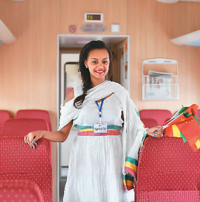2016年10月5日,在埃塞俄比亞首都亞的斯亞貝巴,一名當?shù)厝嗽嚦藖喖F路通車當日的第一列旅客列車。新華社記者 孫瑞博攝