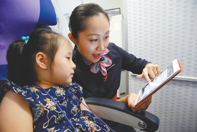 乘務(wù)員利用機(jī)上無線網(wǎng)絡(luò)幫助無陪小旅客與家人空地聯(lián)絡(luò)。(資料圖片)
