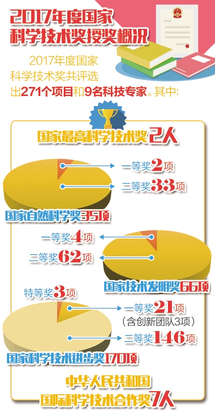 1月8日,2017年度國家科學技術(shù)獎勵大會在北京人民大會堂隆重舉行。2名科學家獲得國家最高科學技術(shù)獎,271個項目獲得國家自然科學獎、國家技術(shù)發(fā)明獎、國家科學技術(shù)進步獎三大獎,7名外籍專家獲得國際合作獎。