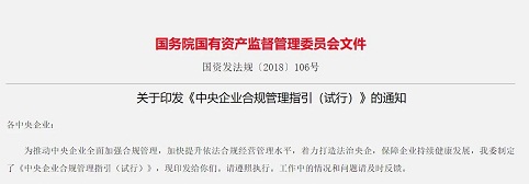 11月2日,國務(wù)院國資委印發(fā)了《中央企業(yè)合規(guī)管理指引(試行)》,推動中央企業(yè)全面加強合規(guī)管理,加快提升依法合規(guī)經(jīng)營管理水平,著力打造法治央企,保障企業(yè)持續(xù)健康發(fā)展。