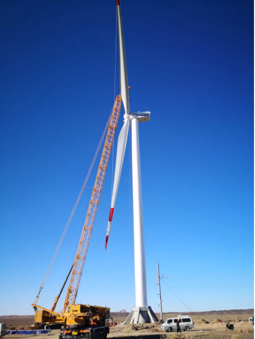 ????近日,中國海裝鑫垣新疆昌吉奇臺北塔山99兆瓦風(fēng)電項目首臺H136-2.2兆瓦機(jī)組完成吊裝。