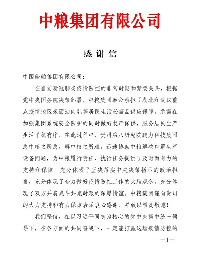 ????在這場(chǎng)戰(zhàn)“疫”中,中國(guó)船舶集團(tuán)沒(méi)有缺席——所屬八院鵬力科技集團(tuán)緊急承擔(dān)平面口罩機(jī)、N95口罩機(jī)、壓條機(jī)等醫(yī)療物資生產(chǎn)關(guān)鍵設(shè)備研制攻關(guān)任務(wù),以“戰(zhàn)時(shí)速度”硬核抗疫。近日,中國(guó)石油、中糧集團(tuán)、中國(guó)誠(chéng)通集團(tuán)等,紛紛發(fā)來(lái)感謝信,對(duì)鵬力科技集團(tuán)的全力支持表達(dá)深深的謝意。