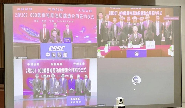 ????5月18日,中國船舶集團(tuán)旗下大船集團(tuán)、中船貿(mào)易與招商局集團(tuán)旗下招商輪船在北京、大連、香港三地以“云簽約”方式簽署2艘30.7萬載重噸原油船建造合同。中國船舶集團(tuán)副總經(jīng)理孫偉、招商局集團(tuán)副總經(jīng)理王宏、招商輪船董事長謝春林出席簽約儀式,中船貿(mào)易董事長李洪濤、大船集團(tuán)總經(jīng)理楊志忠、招商輪船總經(jīng)理王永新代表各方在建造合同上簽字。