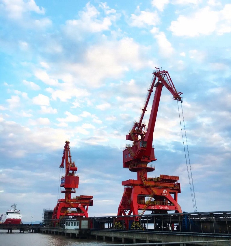 ????近日,武漢船機(jī)海西重機(jī)為寧波舟山港老塘山碼頭打造的2臺(tái)25T-36M四連桿帶斗門(mén)機(jī)順利交付。門(mén)機(jī)額定起重量25噸,工作幅度36米,額定工作效率800噸/時(shí),主要用于煤炭和海沙的卸船作業(yè)。