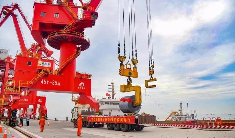 ????該門(mén)機(jī)主要用于成品鋼板、卷裝船及煤炭、廢鋼等裝卸船作業(yè)。門(mén)機(jī)配備有平衡掛梁、廢鋼吸盤(pán)、C字鉤、板杯夾鉗、散貨抓斗、六瓣廢鋼抓斗6種吊具,能滿(mǎn)足從鋼廠(chǎng)原材料海上進(jìn)貨卸船,到成品(鋼卷、鋼板)裝船海運(yùn)等整個(gè)過(guò)程的裝卸需求,改變了鋼廠(chǎng)以往只能依靠陸地貨運(yùn)進(jìn)行成品運(yùn)輸?shù)臓顩r,極大地提高運(yùn)輸效率。