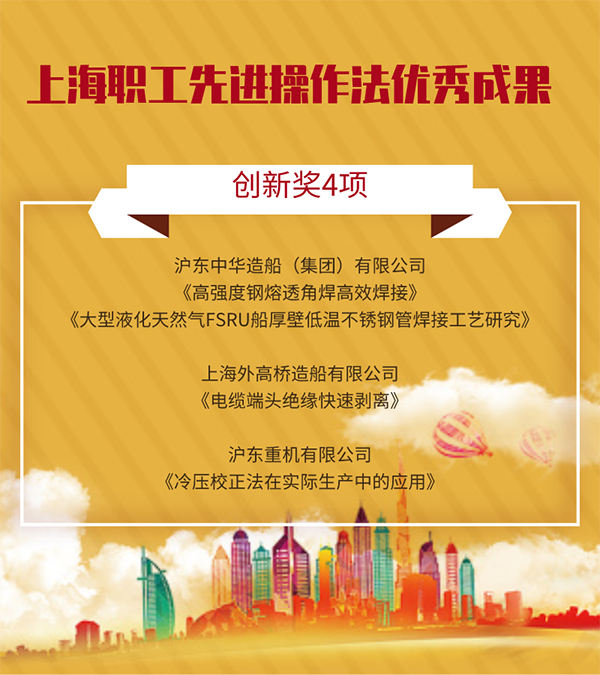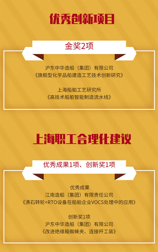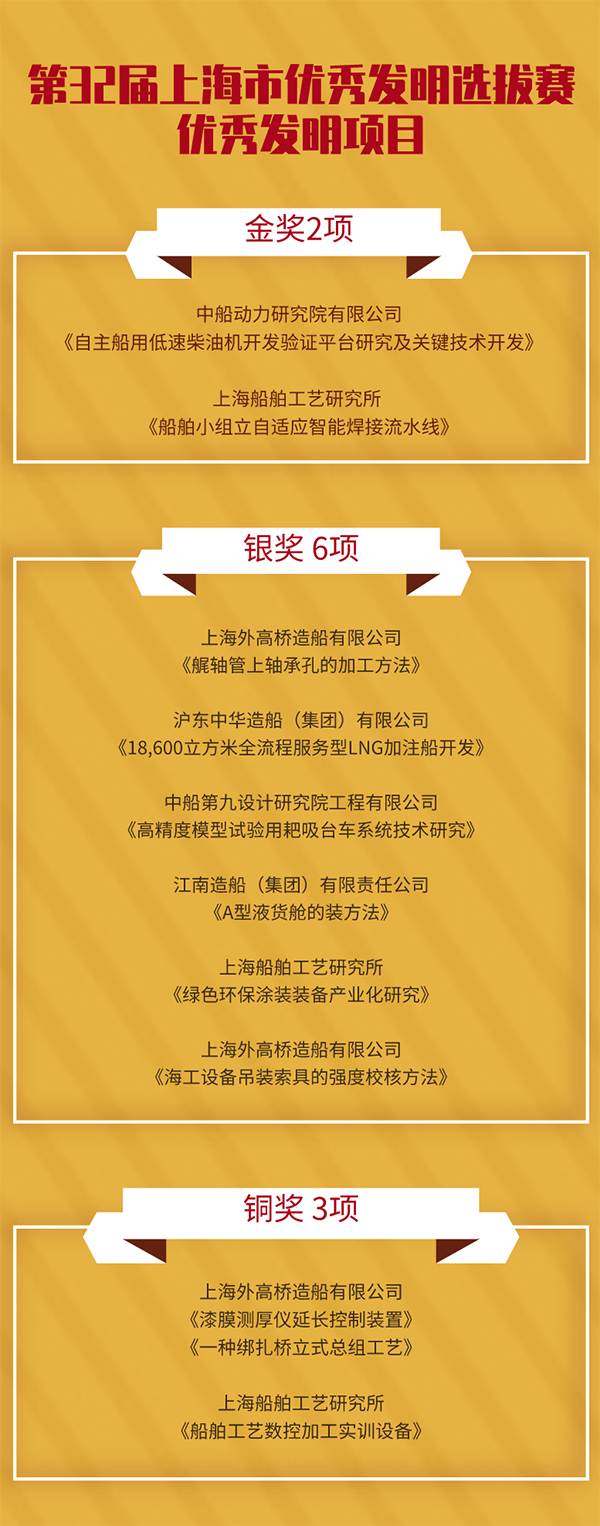 中國(guó)船舶集團(tuán)上海船舶系統(tǒng)共19項(xiàng)職工創(chuàng)新成果,在第32屆上海市優(yōu)秀發(fā)明選拔賽等各項(xiàng)賽事中斬獲佳績(jī)。