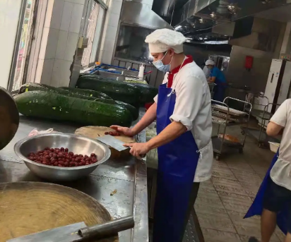 而在技校和養(yǎng)老院的后廚,阮積劍等廚師們同樣已經(jīng)整裝待發(fā)。在社區(qū)封閉初期,飲食服務(wù)部養(yǎng)老院飯?zhí)脝T工由原來的18人劇減至7人。廚師梁志寬面對每日約800人的進(jìn)餐人數(shù),迎難而上,轉(zhuǎn)變菜式花樣,合理優(yōu)化膳食,注重營養(yǎng)搭配,以嫻熟的廚藝獨(dú)自完成后廚大量工作,保證了菜肴準(zhǔn)時(shí)出品。而廚師、黨員陳兆銘得知飯?zhí)靡蚴芤咔橛绊懚耸謬?yán)重不足,在試航歸來做完核酸檢測后立即回到養(yǎng)老院飯?zhí)玫膷徫簧?。為此,他直接把“家”安在了養(yǎng)老院,每天睡在簡易折疊床上。