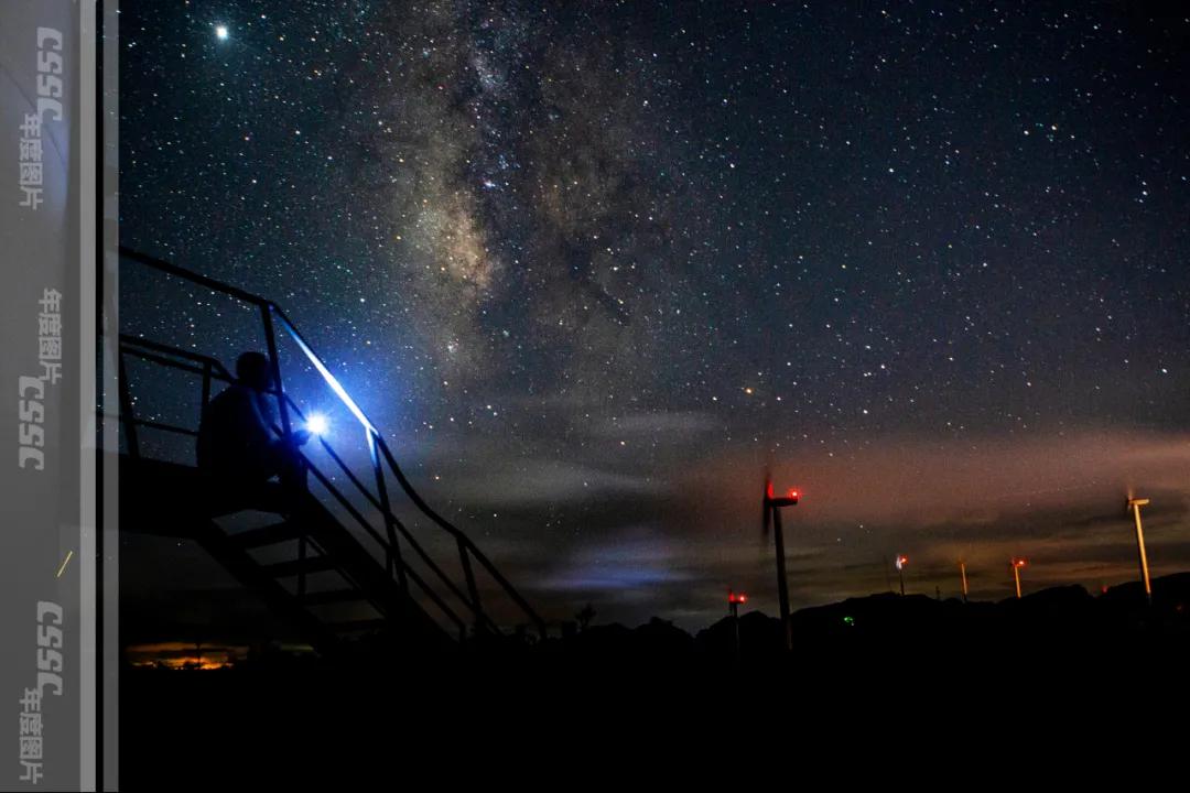 星幕下,中國船舶人在重慶中國海裝南天門風(fēng)電場的漫天星空下,仰望星空,看著風(fēng)機上的航空燈和璀璨的星河遙相呼應(yīng),這一切簡直美得妙不可言!