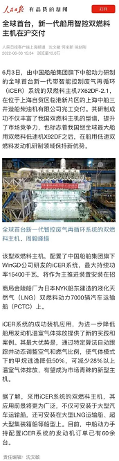 該型雙燃料主機,配置了中國船舶集團旗下WinGD公司研發(fā)的iCER系統(tǒng),最大持續(xù)功率15400千瓦,將作為主推進裝置安裝在招商局金陵船廠為日本NYK船東建造的液化天然氣(LNG)雙燃料動力7000車汽車運輸船(PCTC)上。