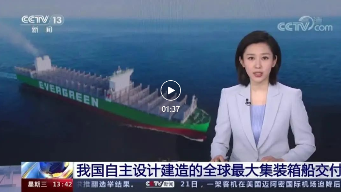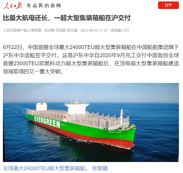 今天,中國首艘全球最大24000TEU超大型集裝箱船在中國船舶集團(tuán)旗下滬東中華簽字交付,比最大航母還長,甲板面積相當(dāng)于3.5個標(biāo)準(zhǔn)足球場,最大堆箱層數(shù)可達(dá)25層,相當(dāng)于22樓的高度……