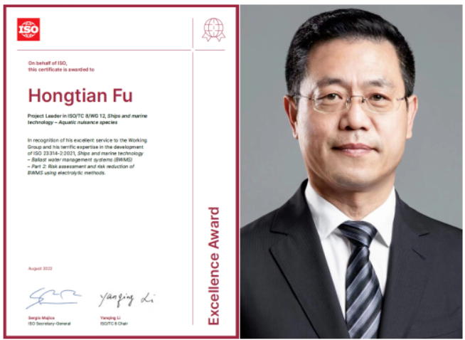 ISO卓越貢獻獎旨在表彰在上一年度ISO國際標準制修訂工作中作出突出貢獻的專家、項目負責人或工作組召集人。此次頒獎表彰了付洪田在ISO 23314-2:2021《船舶與海洋技術—壓載水管理系統(tǒng)—電解法壓載水管理系統(tǒng)的風險評估與風險降低》國際標準研制作出的貢獻。