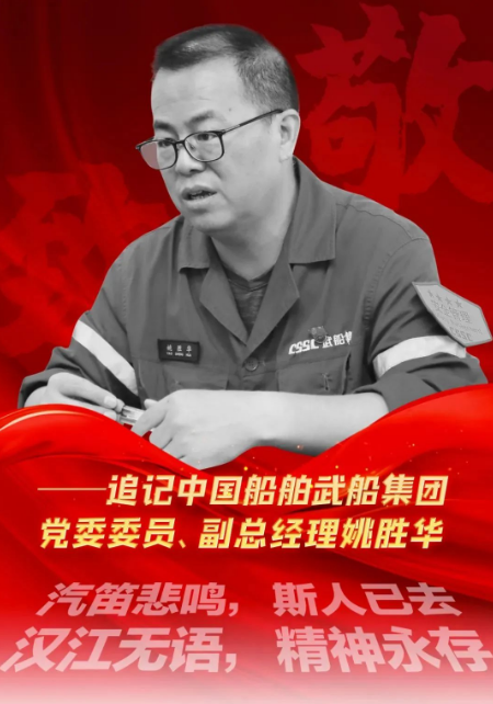 汽笛悲鳴,斯人已去;漢江無語,精神永存。中國船舶集團(tuán)有限公司旗下武昌船舶重工集團(tuán)有限公司黨委委員、副總經(jīng)理姚勝華,一位沉默、訥言的人,他把自己熬干了、燃盡了,默默地用理想和信念、用忠誠和熱血、用苦干與實干鑄就的,是一座偉大的豐碑!他的精神就像一面高高飄揚的旗幟,跨越時空,熠熠生輝!