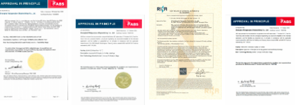 從左至右依次為21萬(wàn)噸紐卡斯?fàn)栃图状既剂蟿?dòng)力散貨船、9200車雙燃料動(dòng)力汽車運(yùn)輸船(PCTC)、創(chuàng)新型30萬(wàn)噸原油輪(VLCC)、115萬(wàn)載重噸氨燃料油輪的AIP證書