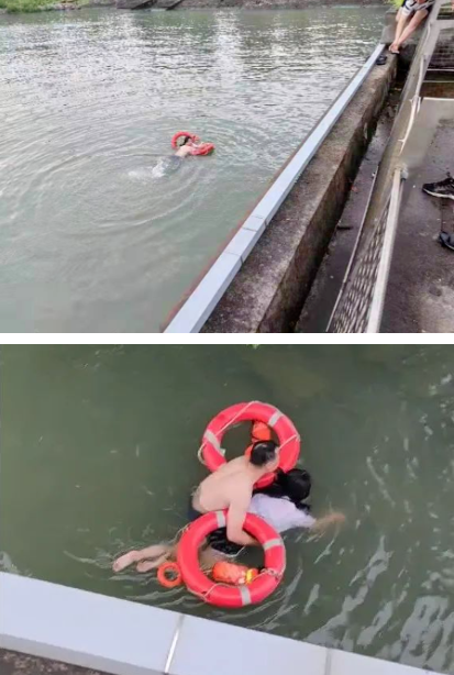就在此時(shí),韭菜港公園保安戴金堂,將綁有繩索的救生圈拋至水中,眭才俊立即托著女子扶上救生圈,竭盡全力游向岸邊。