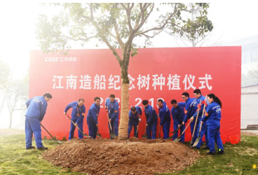 江南造船2023年度先進、勞模代表共同植下了2023年紀(jì)念樹。江南造船每年會在開工第一天種下上一年度的紀(jì)念樹,這是江南造船上島以來種下的第17棵年代樹。