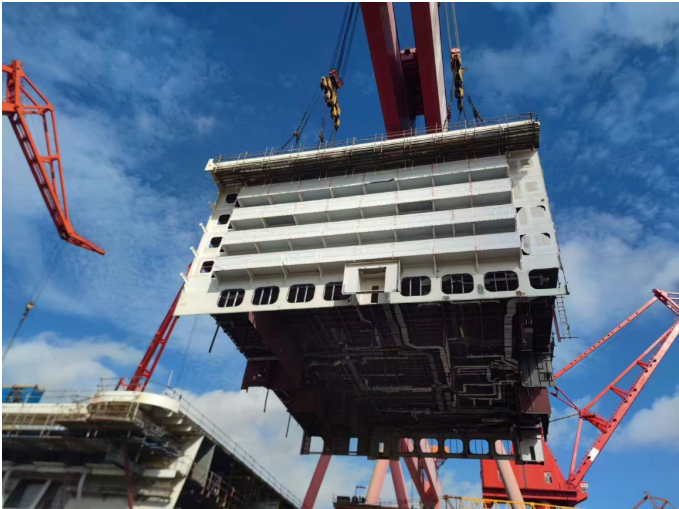 此次完成搭載的U2總段以乘客住艙區(qū)域?yàn)橹?,跨度為五層甲板,是郵輪搭載的首個帶陽臺的總段,其順利搭載是總段完整性建造速度提升和船塢快速搭載的集中體現(xiàn)。