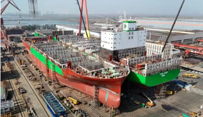 黃埔文沖切實(shí)增強(qiáng)自主開發(fā)能力,堅(jiān)持聚焦主建船型,持續(xù)推廣自主開發(fā)的“鴻鵠”集裝箱船和“海鯨”散貨船系列,成功打造1900TEU集裝箱船、3000TEU集裝箱船、2400TEU甲醇雙燃料集裝箱船和85000噸散貨船等明星船型,形成品牌迭代升級和譜系化;緊抓船舶行業(yè)綠色新能源的機(jī)遇,黃埔文沖以市場需求為導(dǎo)向,承接了多艘以甲醇、氨燃料等綠色能源為動力的集裝箱船和散貨船訂單。
