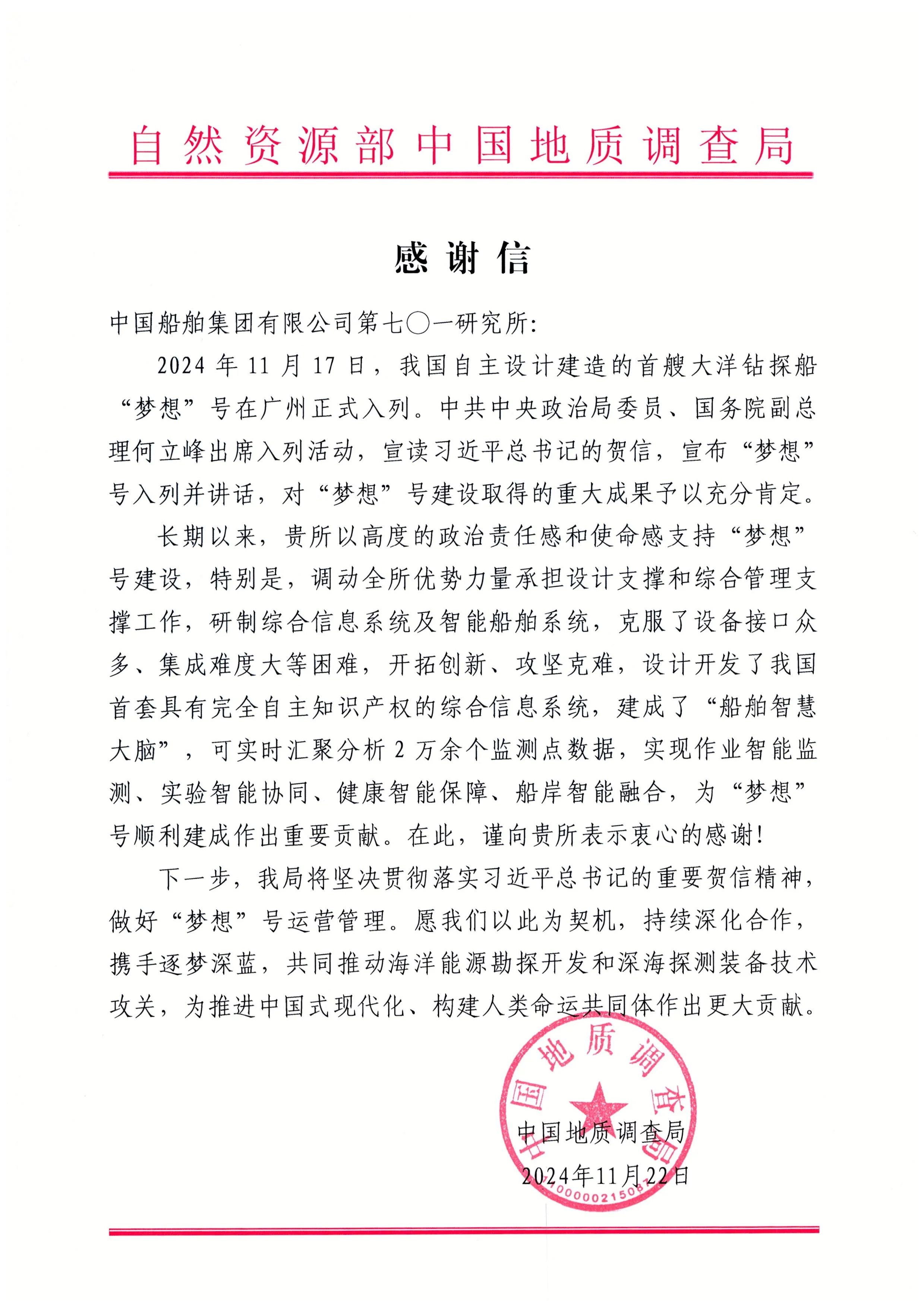 中國(guó)地質(zhì)調(diào)查局在信中對(duì)中國(guó)船舶集團(tuán)七〇八所在“夢(mèng)想”號(hào)立項(xiàng)論證、研發(fā)設(shè)計(jì)、建造調(diào)試等階段所做的突出工作和卓越貢獻(xiàn)表示感謝。