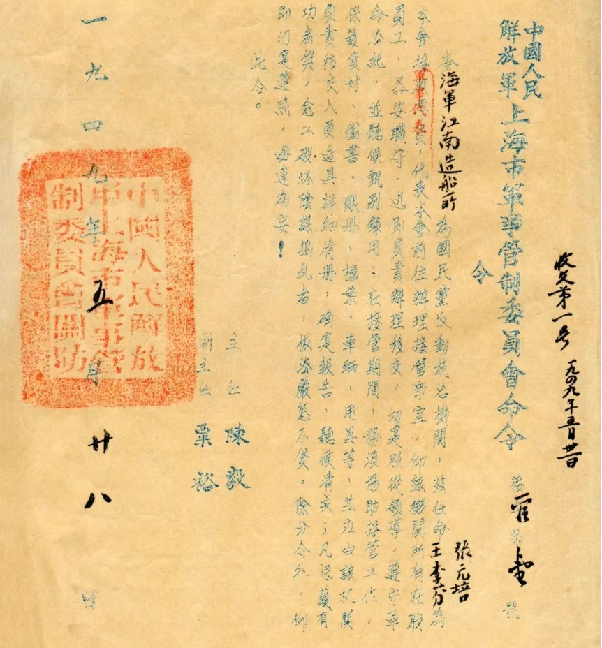 江南之于國(guó)家的戰(zhàn)略意義,周恩來(lái)曾這樣說(shuō)過(guò):“江南造船所是中國(guó)乃至亞洲最大的軍工企業(yè),要爭(zhēng)取在解放軍進(jìn)滬時(shí),安全、完整地交給人民。”1949年5月27日,上海解放。第二天上海市軍管會(huì)主任陳毅、副主任粟裕簽發(fā)第一號(hào)令,宣布接管海軍江南造船所。華東海軍司令員張愛(ài)萍來(lái)到江南造船所和工人們一起投入搶修造船設(shè)施的勞動(dòng)中,江南造船在廢墟上獲得新生。