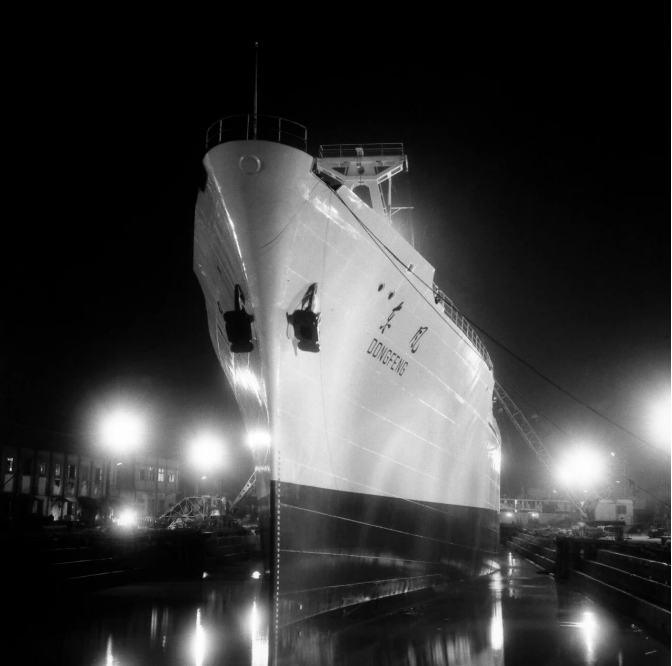 “一五”后期,研制萬(wàn)噸級(jí)遠(yuǎn)洋貨船被列為國(guó)家新科技規(guī)劃的重點(diǎn)項(xiàng)目。在西方長(zhǎng)期封鎖尤其是后來(lái)蘇聯(lián)中止援助的困難局勢(shì)下,“東風(fēng)”號(hào)是中國(guó)人首次嘗試自行設(shè)計(jì)、自行建造,全部采用國(guó)產(chǎn)設(shè)備的首艘萬(wàn)噸遠(yuǎn)洋船。1960年4月15日,“東風(fēng)”號(hào)下水,時(shí)任上海市委書(shū)記陳丕顯、副市長(zhǎng)曹荻秋等人出席下水典禮。萬(wàn)噸輪被命名為“東風(fēng)”號(hào)。