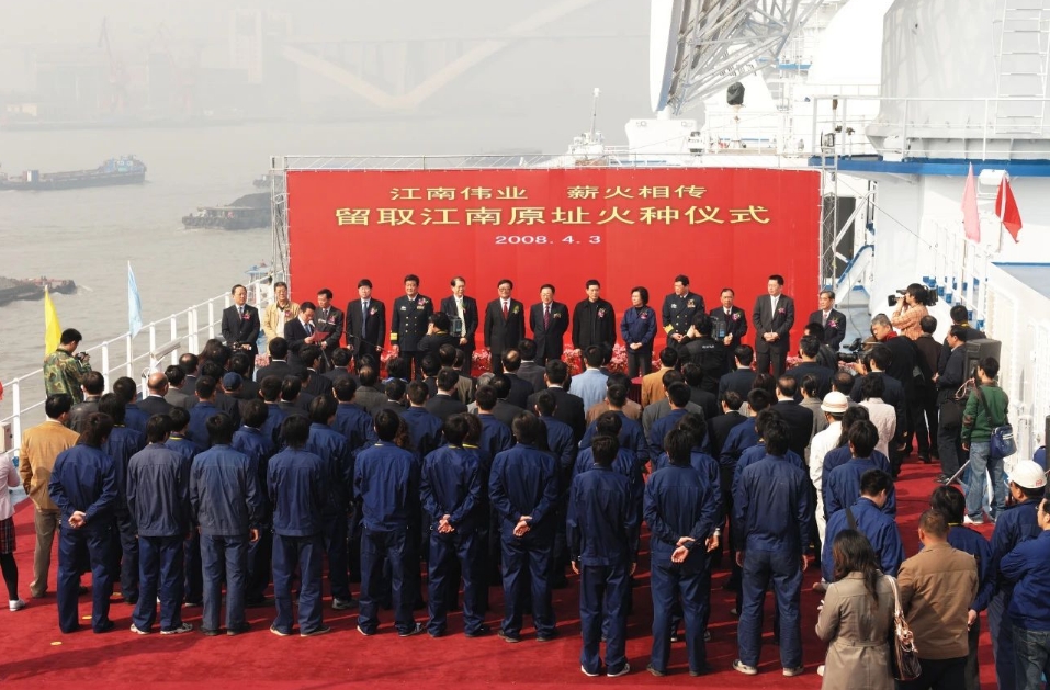 2008年4月,江南造船老廠建造的最后一艘船“遠(yuǎn)望6”號(hào)航天測(cè)量船即將交付。4月3日,時(shí)任江南造船搭載部部長(zhǎng)黃文飛作為取火者從“遠(yuǎn)望6”號(hào)船前甲板的上建位置手拿焊槍取火引燃火炬?;鹁嬉来蝹鬟f至勞動(dòng)模范、三八紅旗手、江南造船領(lǐng)導(dǎo)等,最后傳至?xí)r任中船集團(tuán)總經(jīng)理陳小津手中并由他點(diǎn)燃了火種盒。6月3日,江南造船人親手建造的船舶特地趕回“娘家”,載著江南“火種”駛往新基地,為新建造的產(chǎn)品開(kāi)工點(diǎn)火。