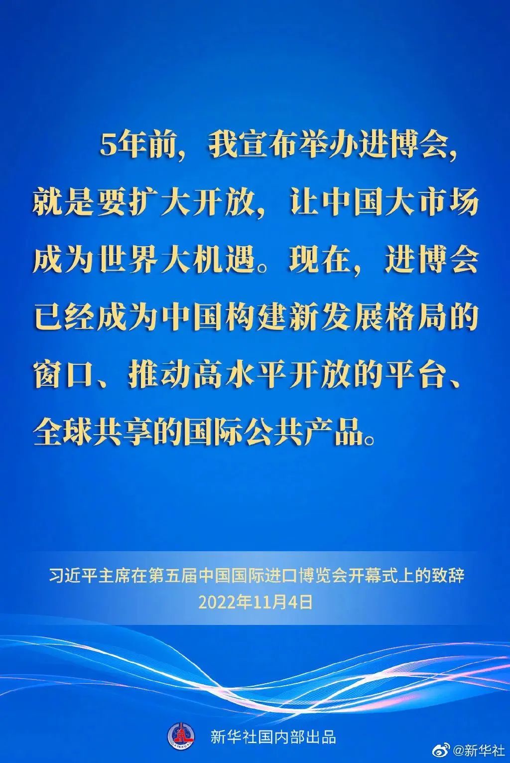 習近平指出,5年前,我宣布舉辦進博會,就是要擴大開放,讓中國大市場成為世界大機遇?,F(xiàn)在,進博會已經(jīng)成為中國構(gòu)建新發(fā)展格局的窗口、推動高水平開放的平臺、全球共享的國際公共產(chǎn)品。