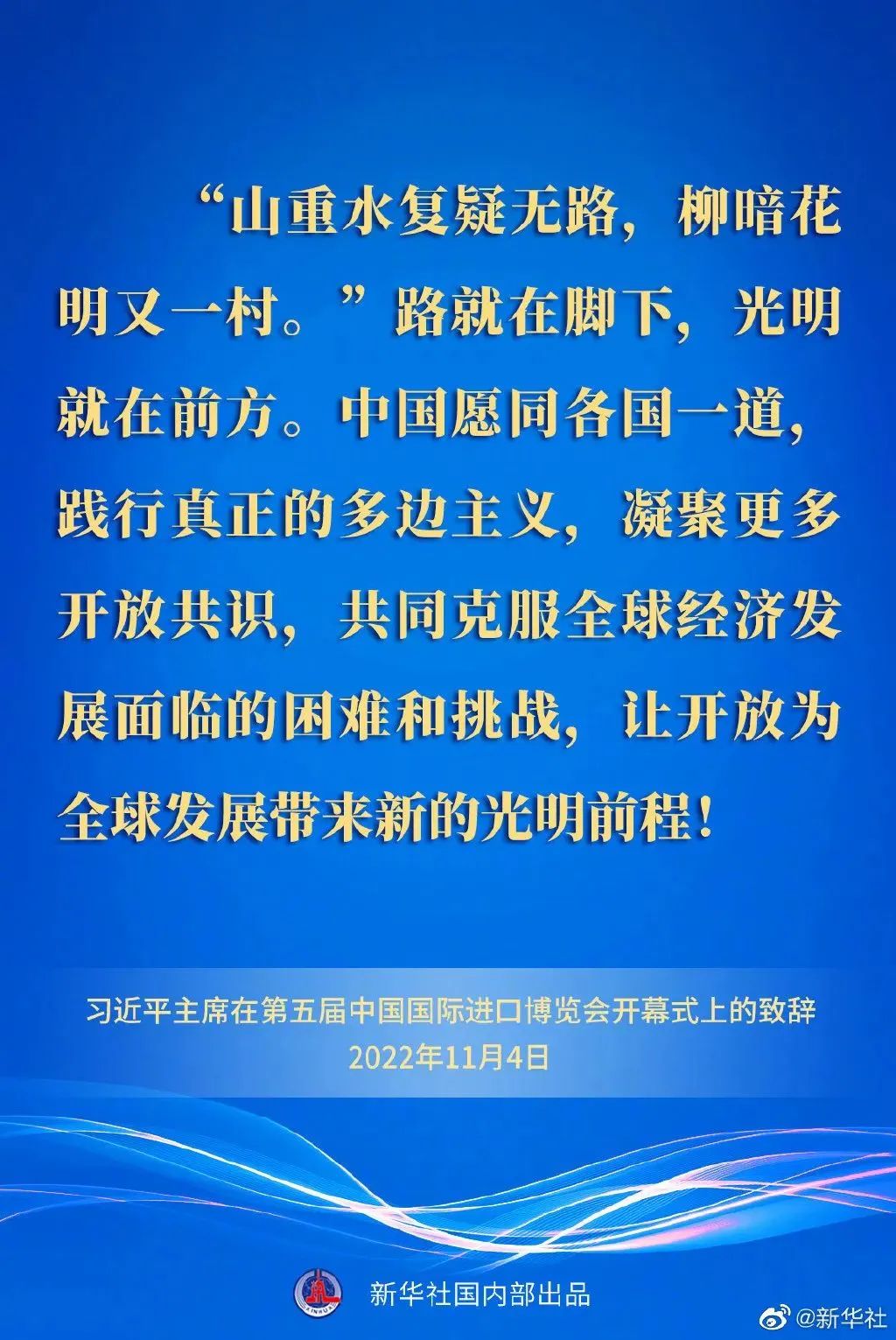 習近平最后強調(diào),路就在腳下,光明就在前方。中國愿同各國一道,踐行真正的多邊主義,凝聚更多開放共識,共同克服全球經(jīng)濟發(fā)展面臨的困難和挑戰(zhàn),讓開放為全球發(fā)展帶來新的光明前程!