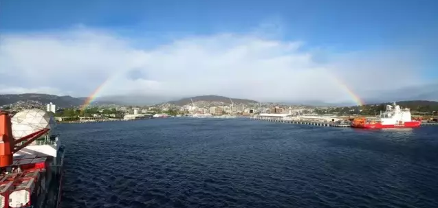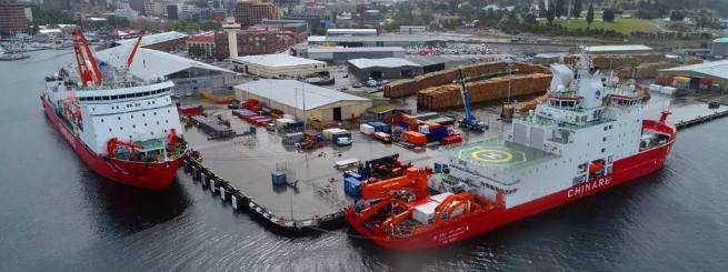????當(dāng)?shù)貢r間11月7日上午,搭載107名中國第36次南極考察隊員的“雪龍”號??堪拇罄麃喕舭吞馗劭?,與先行靠港的“雪龍2”號正式匯合。