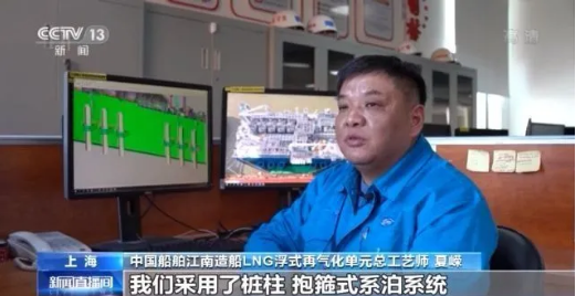 中國船舶集團(tuán)旗下江南造船LNG浮式再氣化單元總工藝師 夏嶸:與常規(guī)船舶采用纜繩系泊不同,我們采用了樁柱—抱箍式系泊系統(tǒng)。該套系統(tǒng)能夠滿足FRU在部署地營運(yùn)期間永久性碼頭系泊的需要。