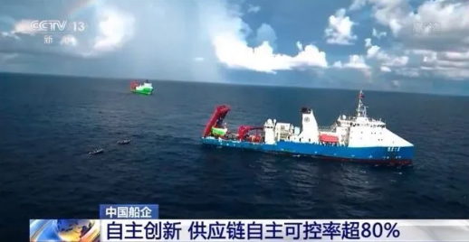 這是去年“奮斗者”號載人潛水器在馬里亞納海溝10909米處成功坐底的畫面,由中國船舶集團(tuán)研制的“奮斗者”號載人潛水器是我國首臺具備全球海域載人進(jìn)入能力的重要裝備。據(jù)測算,“奮斗者”號的國產(chǎn)化率超過了96.5%。同樣在民用船舶方面,整船的國產(chǎn)化率也有明顯提升。這是由中國船舶廣船國際完成的阿爾及利亞客滾船,具有完全的自主知識產(chǎn)權(quán)。
