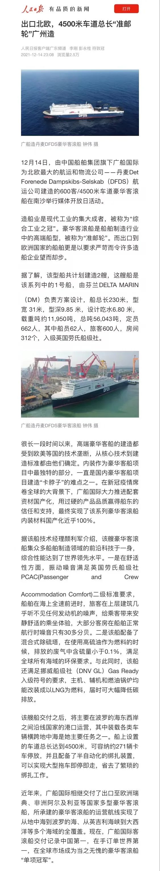 對這艘“準郵輪”的高端船舶,媒體盛贊廣船國際在新冠疫情席卷全球的大背景下,大力推進配套資材國產(chǎn)化,用過硬的產(chǎn)品品質贏得船東的信任和支持,最終實現(xiàn)了該系列豪華客滾船內(nèi)裝材料國產(chǎn)化近乎100%,是當之無愧的豪華客滾船“單項冠軍”。