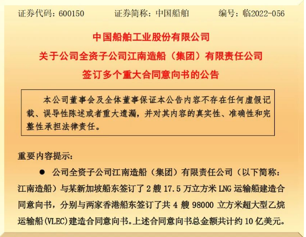 10月25日,中國(guó)船舶集團(tuán)有限公司旗下上市公司中國(guó)船舶工業(yè)股份有限公司發(fā)布《關(guān)于公司全資子公司江南造船(集團(tuán))有限責(zé)任公司簽訂多個(gè)重大合同意向書(shū)》的公告。根據(jù)公告,江南造船共與相關(guān)船東簽署了2型6艘約10億美元新船建造合同意向書(shū)。
