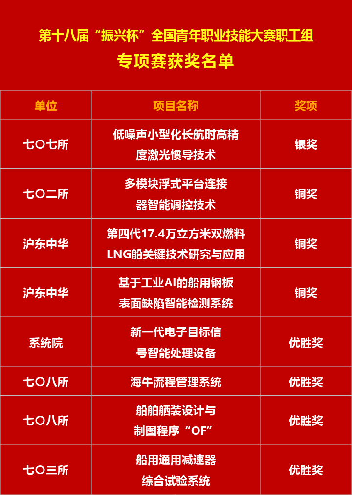 11月15日,第十八屆“振興杯”全國(guó)青年職業(yè)技能大賽職工組全國(guó)決賽在沈陽落下帷幕,中國(guó)船舶集團(tuán)青年取得主體賽(職業(yè)技能競(jìng)賽)“1銀2銅7優(yōu)勝獎(jiǎng)”、專項(xiàng)賽(創(chuàng)新創(chuàng)效競(jìng)賽)“1銀3銅4優(yōu)勝獎(jiǎng)”的好成績(jī)。其中,黃埔文沖吳道升、七〇七所“低噪聲小型化長(zhǎng)航時(shí)高精度激光慣導(dǎo)技術(shù)”項(xiàng)目分獲銀獎(jiǎng),在“青春競(jìng)技場(chǎng)”上展現(xiàn)了船舶青年的自信卓越風(fēng)采。